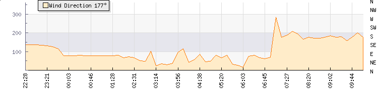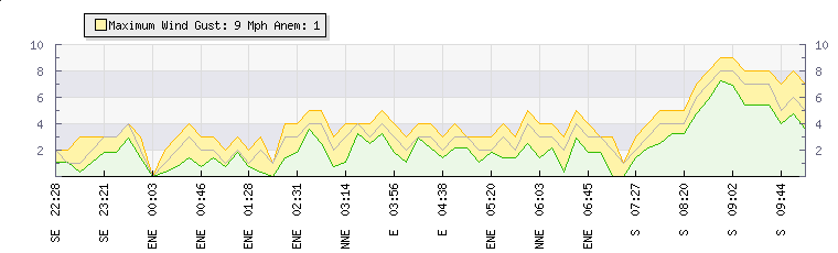 In the last few minutes the wind was Southerly at an average speed of 5 mph, reaching up to 7 mph and a low of 4 mph. The gust strength is3 mph above the minimum speed |