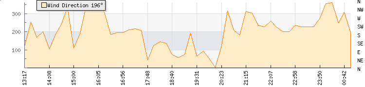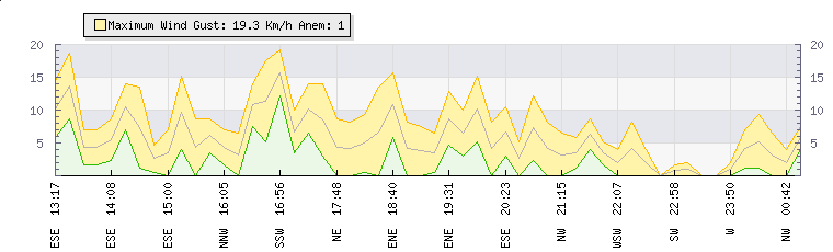 In the last few minutes the wind was North North West at an average speed of 4 kmh, reaching up to 7 kmh and a low of 2 kmh. The gust strength is5 kmh above the minimum speed |