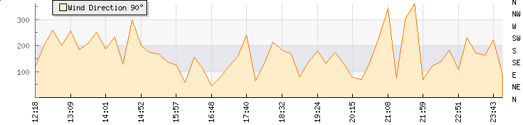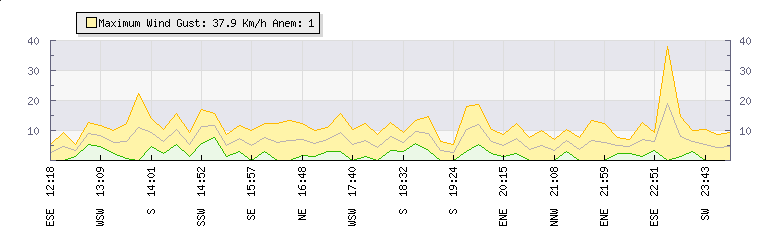 In the last few minutes the wind was Southerly at an average speed of 7 kmh, reaching up to 13 kmh and a low of 1 kmh. The gust strength is12 kmh above the minimum speed |