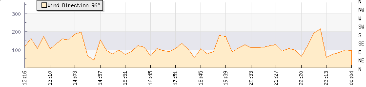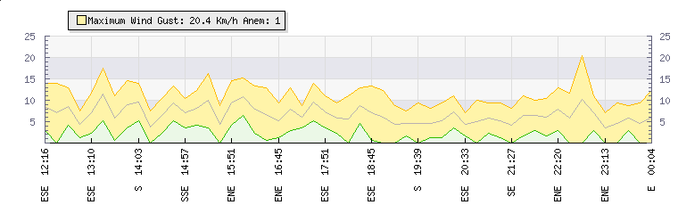 In the last few minutes the wind was East North East at an average speed of 8 kmh, reaching up to 13 kmh and a low of 3 kmh. The gust strength is10 kmh above the minimum speed |