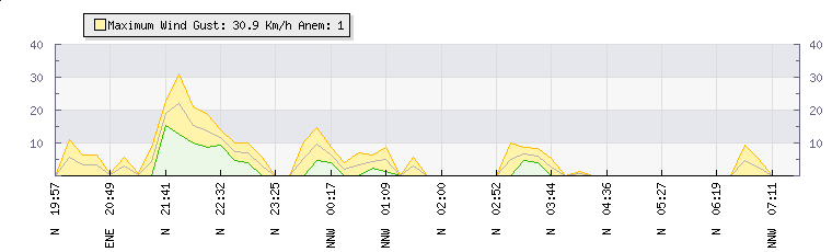 In the last few minutes the wind was Northerly at an average speed of 0 kmh, reaching up to 0 kmh and a low of 0 kmh. The gust strength is0 kmh above the minimum speed |