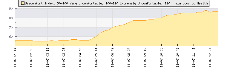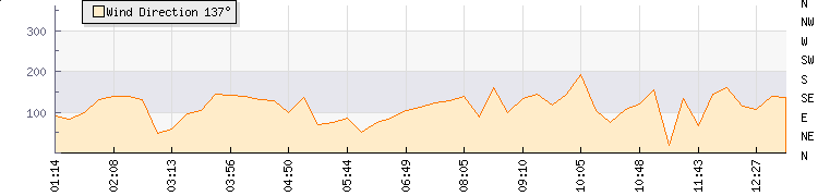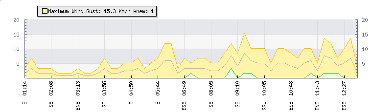 In the last few minutes the wind was East North East at an average speed of 5 kmh, reaching up to 10 kmh and a low of 0 kmh. The gust strength is10 kmh above the minimum speed |