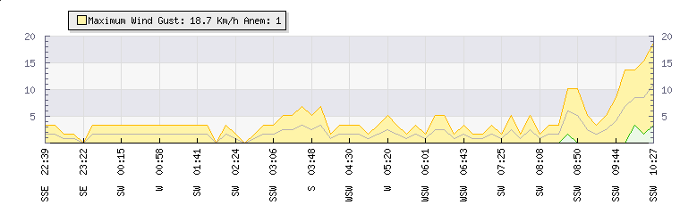 In the last few minutes the wind was South Westerly at an average speed of 3 kmh, reaching up to 5 kmh and a low of 0 kmh. The gust strength is5 kmh above the minimum speed |
