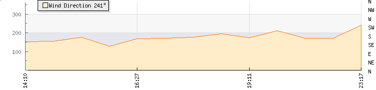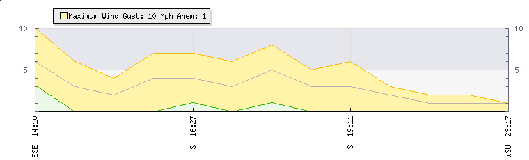 In the last few minutes the wind was South South West at an average speed of 3 mph, reaching up to 5 mph and a low of 0 mph. The gust strength is5 mph above the minimum speed |