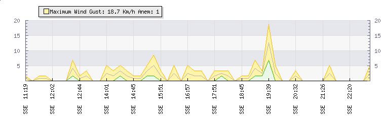 In the last few minutes the wind was South South East at an average speed of 3 kmh, reaching up to 5 kmh and a low of 0 kmh. The gust strength is5 kmh above the minimum speed |