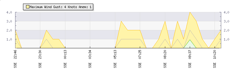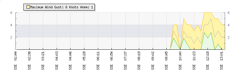 In the last few minutes the wind was South South East at an average speed of 0 knots, reaching up to 0 knots and a low of 0 knots. The gust strength is0 knots above the minimum speed |