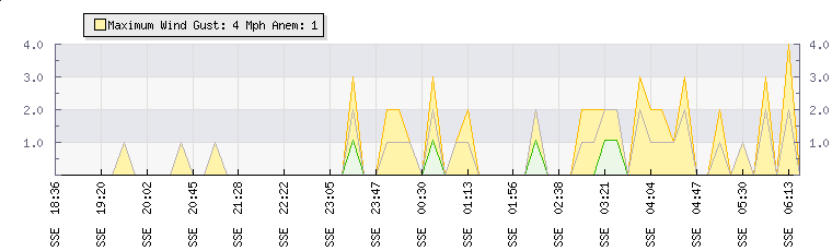In the last few minutes the wind was South South East at an average speed of 1 mph, reaching up to 2 mph and a low of 0 mph. The gust strength is2 mph above the minimum speed |