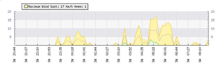 In the last few minutes the wind was South Westerly at an average speed of 3 kmh, reaching up to 5 kmh and a low of 0 kmh. The gust strength is5 kmh above the minimum speed |