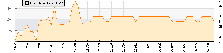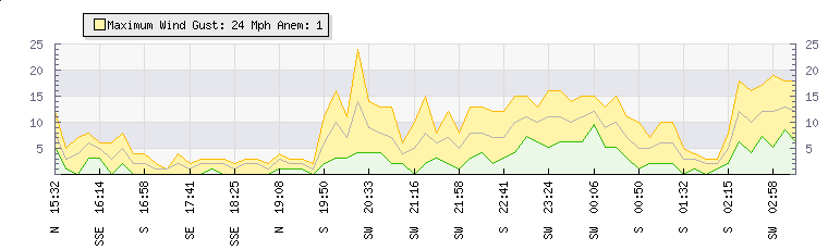In the last few minutes the wind was Southerly at an average speed of 3 mph, reaching up to 5 mph and a low of 0 mph. The gust strength is5 mph above the minimum speed |