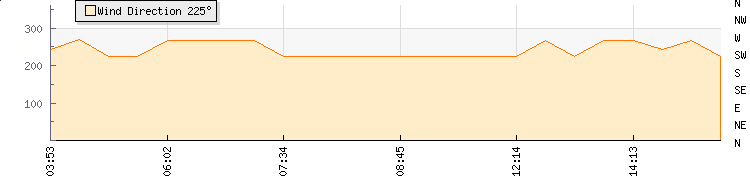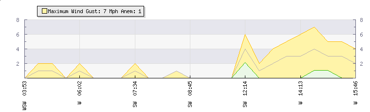 In the last few minutes the wind was Westerly at an average speed of 3 mph, reaching up to 6 mph and a low of 0 mph. The gust strength is6 mph above the minimum speed |