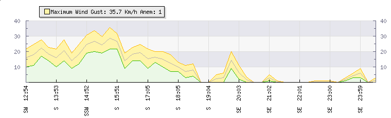 In the last few minutes the wind was South South West at an average speed of 28 kmh, reaching up to 36 kmh and a low of 21 kmh. The gust strength is15 kmh above the minimum speed |