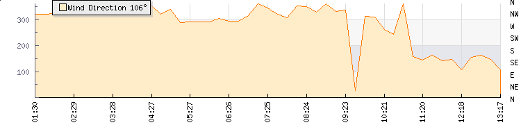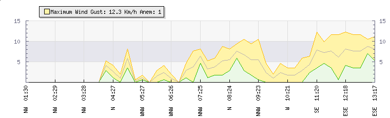 In the last few minutes the wind was South Easterly at an average speed of 8 kmh, reaching up to 12 kmh and a low of 4 kmh. The gust strength is8 kmh above the minimum speed |