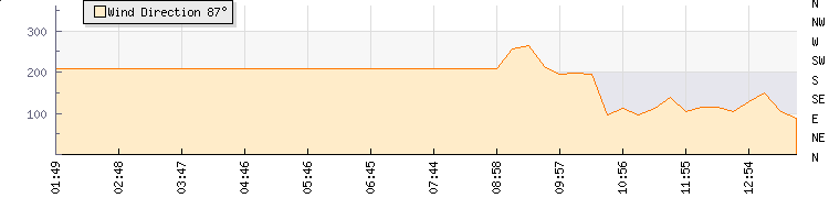 In the last few minutes the wind was East South East at an average speed of 8 kmh, reaching up to 11 kmh and a low of 5 kmh. The gust strength is6 kmh above the minimum speed |
