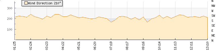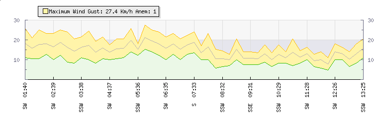 In the last few minutes the wind was South Westerly at an average speed of 13 kmh, reaching up to 16 kmh and a low of 10 kmh. The gust strength is6 kmh above the minimum speed |