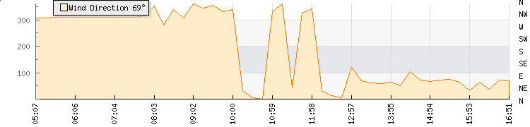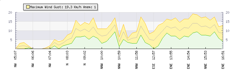 In the last few minutes the wind was East North East at an average speed of 12 kmh, reaching up to 17 kmh and a low of 8 kmh. The gust strength is9 kmh above the minimum speed |