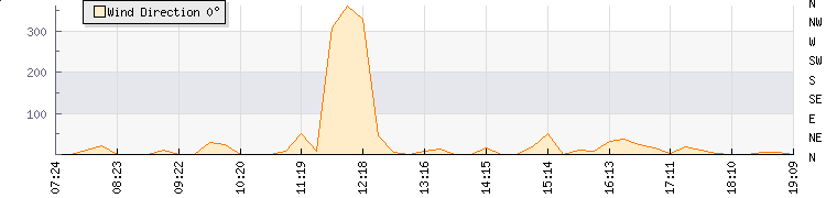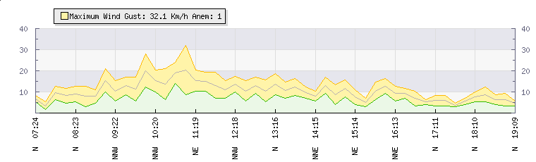 In the last few minutes the wind was Northerly at an average speed of 6 kmh, reaching up to 7 kmh and a low of 4 kmh. The gust strength is3 kmh above the minimum speed |