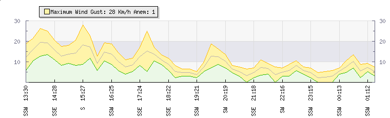 In the last few minutes the wind was West South West at an average speed of 3 kmh, reaching up to 5 kmh and a low of 0 kmh. The gust strength is5 kmh above the minimum speed |