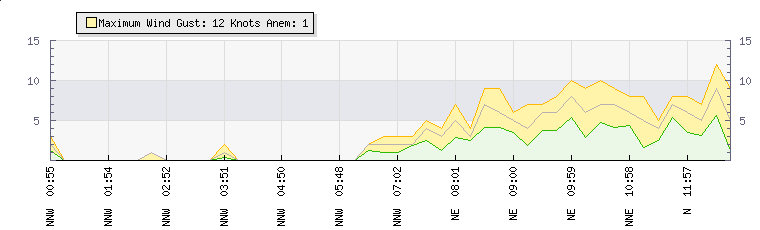 In the last few minutes the wind was North North East at an average speed of 6 knots, reaching up to 8 knots and a low of 4 knots. The gust strength is4 knots above the minimum speed |