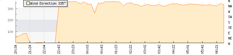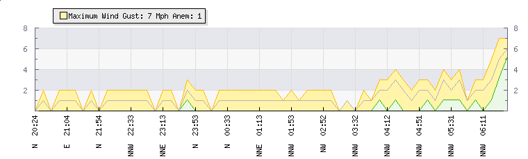 In the last few minutes the wind was North North East at an average speed of 1 mph, reaching up to 2 mph and a low of 0 mph. The gust strength is2 mph above the minimum speed |