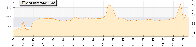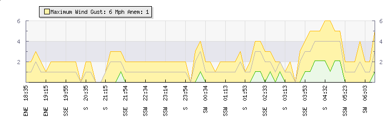 In the last few minutes the wind was South South East at an average speed of 3 mph, reaching up to 4 mph and a low of 1 mph. The gust strength is3 mph above the minimum speed |