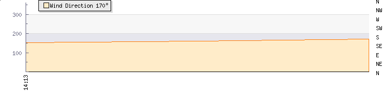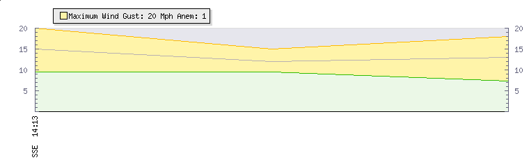 In the last few minutes the wind was Southerly at an average speed of 13 mph, reaching up to 18 mph and a low of 7 mph. The gust strength is11 mph above the minimum speed |