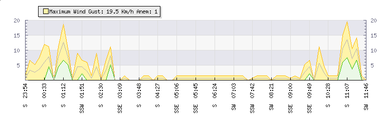 In the last few minutes the wind was South South East at an average speed of 0 kmh, reaching up to 0 kmh and a low of 0 kmh. The gust strength is0 kmh above the minimum speed |