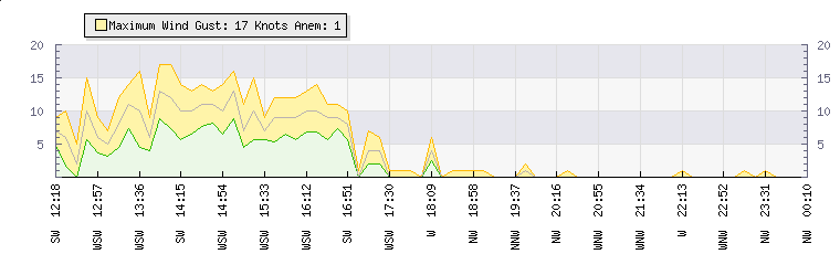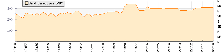 In the last few minutes the wind was West North West at an average speed of 0 knots, reaching up to 0 knots and a low of 0 knots. The gust strength is0 knots above the minimum speed |