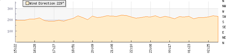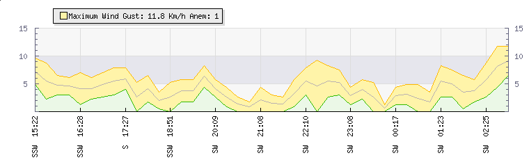 In the last few minutes the wind was South South West at an average speed of 5 kmh, reaching up to 7 kmh and a low of 3 kmh. The gust strength is4 kmh above the minimum speed |