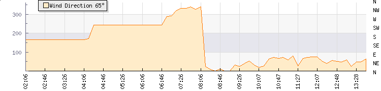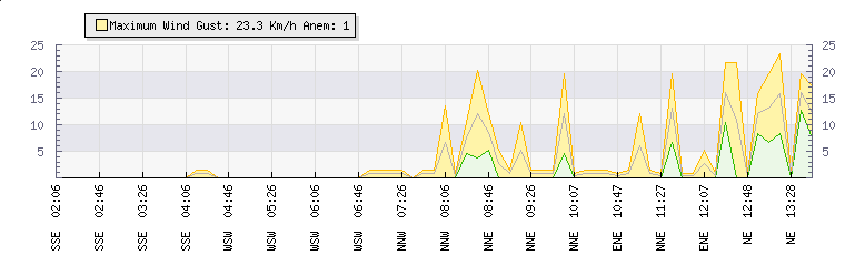 In the last few minutes the wind was North Easterly at an average speed of 16 kmh, reaching up to 22 kmh and a low of 11 kmh. The gust strength is11 kmh above the minimum speed |
