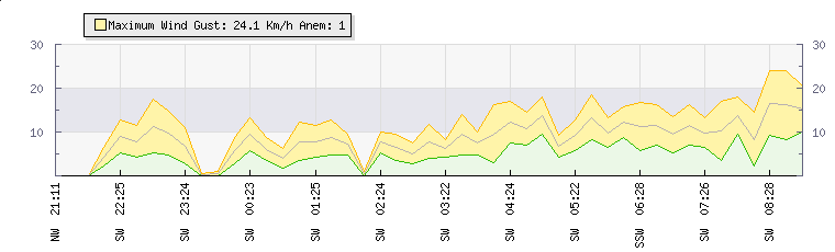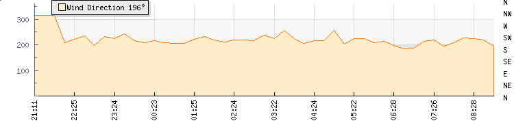 In the last few minutes the wind was South Westerly at an average speed of 10 kmh, reaching up to 13 kmh and a low of 7 kmh. The gust strength is6 kmh above the minimum speed |
