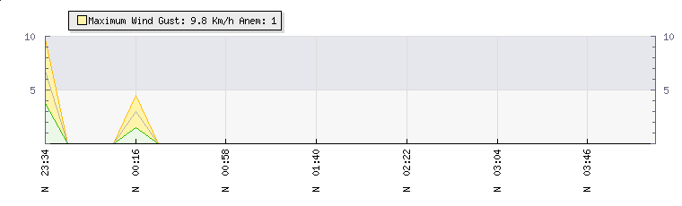 In the last few minutes the wind was Northerly at an average speed of 0 kmh, reaching up to 0 kmh and a low of 0 kmh. The gust strength is0 kmh above the minimum speed |