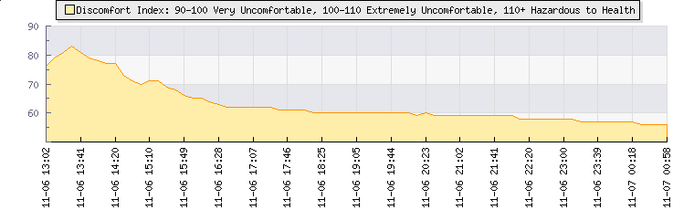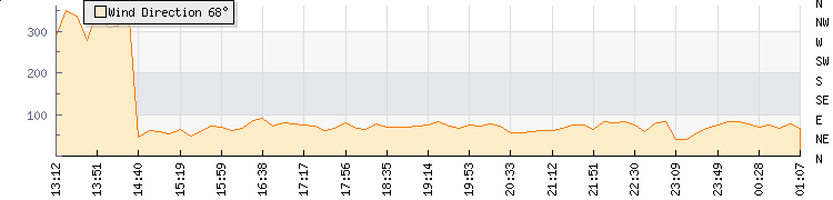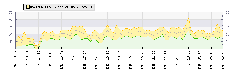 In the last few minutes the wind was North Easterly at an average speed of 11 kmh, reaching up to 13 kmh and a low of 9 kmh. The gust strength is4 kmh above the minimum speed |