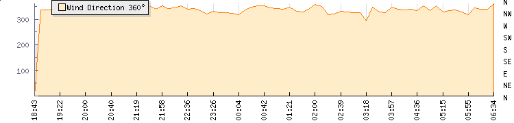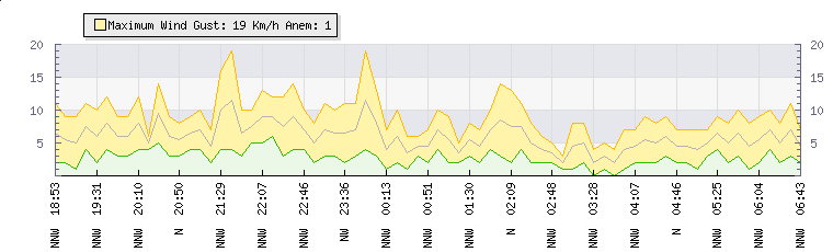 In the last few minutes the wind was West North West at an average speed of 5 kmh, reaching up to 8 kmh and a low of 2 kmh. The gust strength is6 kmh above the minimum speed |