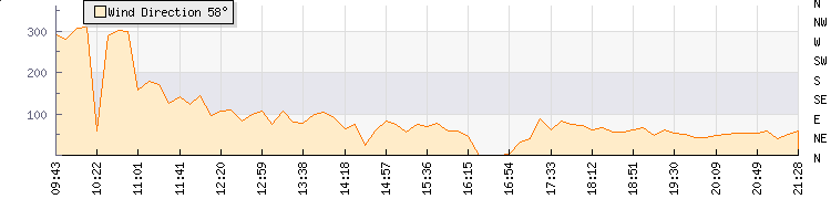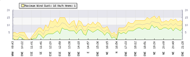 In the last few minutes the wind was East North East at an average speed of 10 kmh, reaching up to 13 kmh and a low of 7 kmh. The gust strength is6 kmh above the minimum speed |