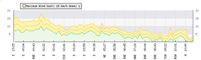 In the last few minutes the wind was West South West at an average speed of 2 kmh, reaching up to 4 kmh and a low of 0 kmh. The gust strength is4 kmh above the minimum speed |