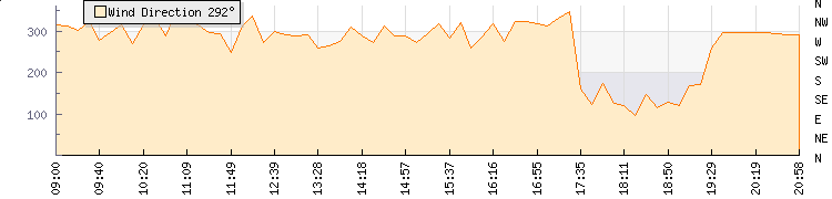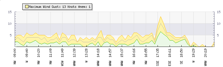 In the last few minutes the wind was West North West at an average speed of 0 knots, reaching up to 0 knots and a low of 0 knots. The gust strength is0 knots above the minimum speed |