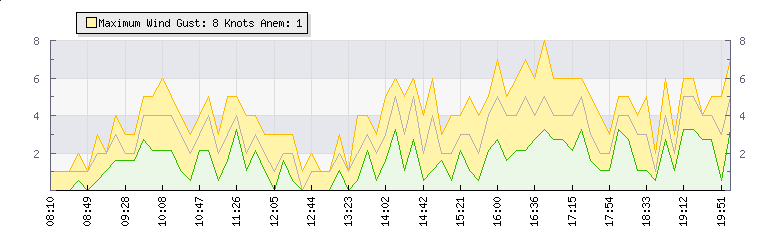 In the last few minutes the wind was blowing at an average speed of 2 knots, reaching up to 3 knots and a low of 1 knots. The gust strength is2 knots above the minimum speed |