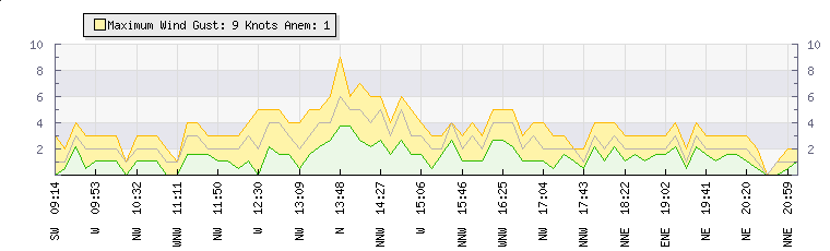 In the last few minutes the wind was North North East at an average speed of 2 knots, reaching up to 3 knots and a low of 1 knots. The gust strength is2 knots above the minimum speed |