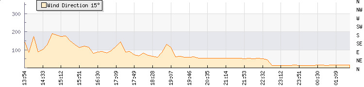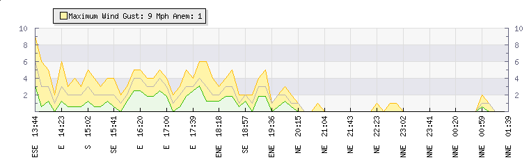 In the last few minutes the wind was North North East at an average speed of 0 mph, reaching up to 0 mph and a low of 0 mph. The gust strength is0 mph above the minimum speed |