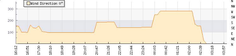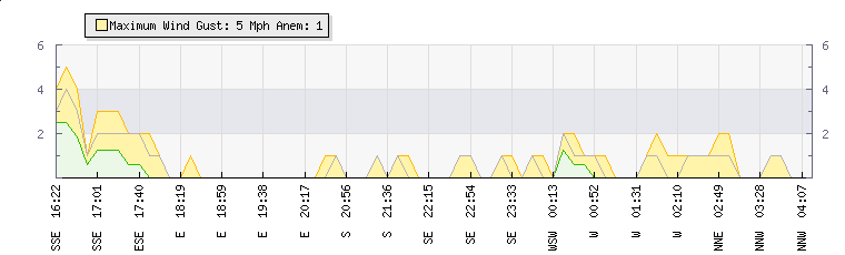 In the last few minutes the wind was South South East at an average speed of 1 mph, reaching up to 1 mph and a low of 0 mph. The gust strength is1 mph above the minimum speed |