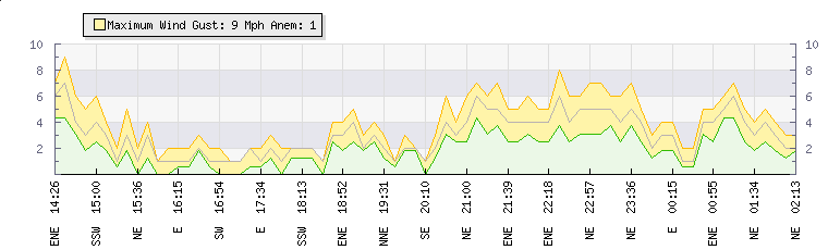 In the last few minutes the wind was East North East at an average speed of 4 mph, reaching up to 5 mph and a low of 2 mph. The gust strength is3 mph above the minimum speed |
