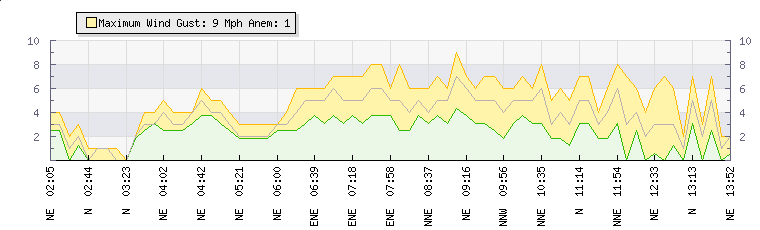In the last few minutes the wind was North Easterly at an average speed of 3 mph, reaching up to 6 mph and a low of 1 mph. The gust strength is5 mph above the minimum speed |