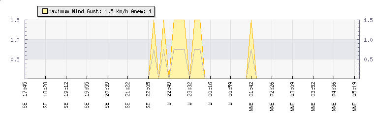 In the last few minutes the wind was North North East at an average speed of 0 kmh, reaching up to 0 kmh and a low of 0 kmh. The gust strength is0 kmh above the minimum speed |