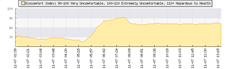| Wind Speed: | 13|17|21 knots | Wind Direction: | W 262° | Temperature: | 21.7°C | | Wet Bulb: | 18.7°C | Discomfort: | 84 | Humidity: | 76% | | Rainfall Today: | 0mm | 12 hrs Rainfall: | 0mm | 24 hrs Rainfall: | 0mm | | Barometer: | 1020mb | Dew Point: | 17.3°C | Clouds AGL: | 1769ft (539 m) | | Density-Alt: | 801ft (244 m) | Fire Danger: | |