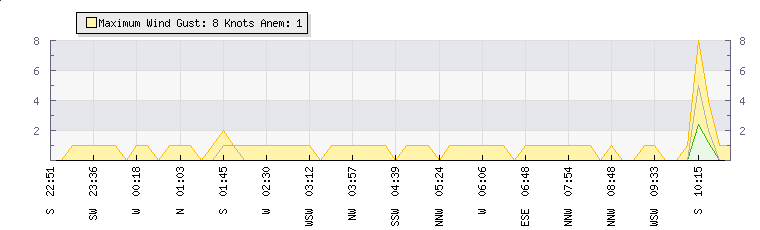 In the last few minutes the wind was North North West at an average speed of 0 knots, reaching up to 0 knots and a low of 0 knots. The gust strength is0 knots above the minimum speed |