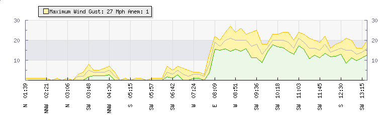 | Wind Gust: | 27 mph | Min Temp: | 14.4 °C | Max Temp: | 24.7 °C | | Wind Average: | 21 mph | Min Hum: | 67 % | Max Hum: | 90 % | |  |