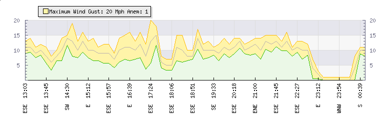 | Wind Gust: | 20 mph | Min Temp: | 18.9 °C | Max Temp: | 22.4 °C | | Wind Average: | 15 mph | Min Hum: | 78 % | Max Hum: | 97 % | |  |