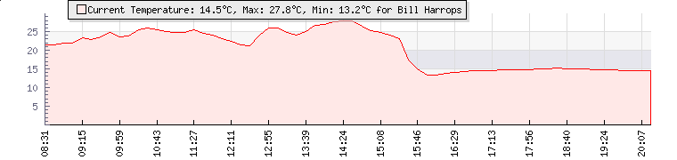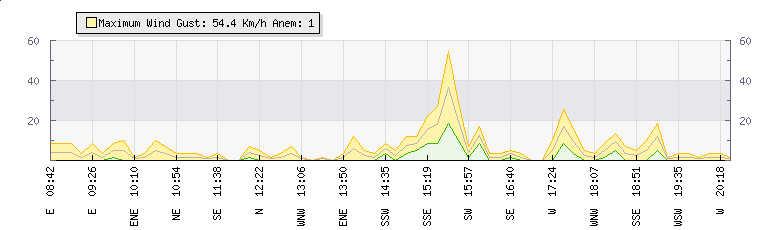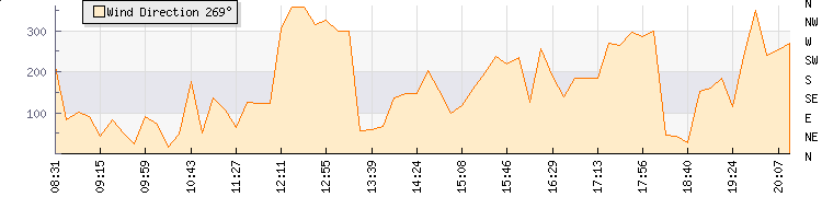In the last few minutes the wind was Westerly at an average speed of 17 kmh, reaching up to 26 kmh and a low of 9 kmh. The gust strength is17 kmh above the minimum speed |