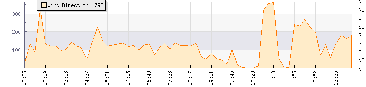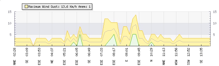 In the last few minutes the wind was South South West at an average speed of 2 kmh, reaching up to 3 kmh and a low of 0 kmh. The gust strength is3 kmh above the minimum speed |