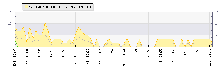 In the last few minutes the wind was Easterly at an average speed of 2 kmh, reaching up to 3 kmh and a low of 0 kmh. The gust strength is3 kmh above the minimum speed |